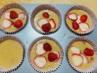 食育指導員のMoxaです。 「旬の食材でお菓子作り」、今年度も引き続き作りたいです! マフィンは簡単に作れるので、よく作ります。 バナナは年中手に入るので、よく作っていたバナナマフィン。 作っているうちにバターが多いと気になり始めました。 最近、パティスリーで米粉のお菓子よく見かけるなあ〜 ということから、まずは米粉と米油でバナナマフィンを焼いてみました。 生地にバナナを潰したのを練り込んだら、バナナ風味がアップしました。 では、苺で作ってみよう!見た目も可愛いと思って、早速作りました。 苺が新鮮でお安く買える今、是非とも、ヘルシーなマフィンはいかがでしょう?<材料> (マフィン型6個分) 苺 (飾り用)5粒 (潰す用) 50g 製菓用米粉 100g アーモンドパウダー 30g ベーキングパウダー 3g 全卵 100g きび砂糖 70g 米油 60g 生クリーム 30g ラム酒 6g <作り方> 1 飾り用の苺はスライスし、混ぜ込む用の苺は適当に潰しておく。 2 ボウルに卵、きび砂糖、米油、生クリーム、ラム酒を入れて泡立て器でよくかき混ぜる。 3 潰した苺を入れて混ぜる。 4 米粉、アーモンドパウダー、ベーキングパウダーを加えてしっかり混ぜ合わせる 。 5 マフィン型にグラシンカップを入れ、生地を入れる。 6 スライスした苺をのせる。