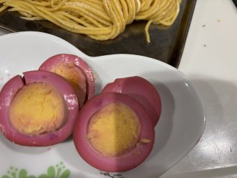 ビーツの茹で汁は捨てずに置いておき、ゆで卵を一晩つけると、色づけになります。