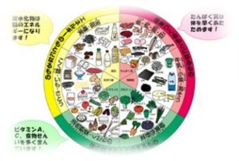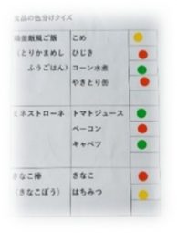 高いところに逃げる、ランドセルで頭を守る、倒れそうな物に近づかないなど多く活発な発言意見が出ました。 『災害時、電気・ガス・水道が止まることがありますね、食事はどうしましょうか?お家に備えてあるものでおいしい料理ができますよ』とポリ袋クッキングを紹介し、調理を行いました。メニューは鶏釜飯風ご飯、ミネストローネ、きなこ棒です。低学年が主になることを想定して包丁は使わず、キッチンバサミで対応できるメニューを選びました。2人1組になり、ポリ袋を持つ人、ポリ袋に食材を入れる人と協力し合って楽しそうに手際よくクッキングしました。湯煎加熱中にA4のチラシで紙皿作りです。もうすでに知っている子もいて、教えあったりしてスムーズに作りました。作ったお皿にポリ袋をかけて、鶏釜飯風ご飯を盛り付けて試食しました。試食タイムも落ち着いた頃、食品の色分けクイズを行いました。災害時にも食べ物の偏りをチェックするためで、まず、食品の色分け方法を伝え、今日使った食品を色分けしてみました。結果、バランスよく含まれていることを確認しました。