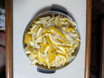 鍋に水と柚子の皮を入れて火にかけ、2回ほど茹でこぼします。