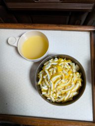 ①柚子は半分に切り、汁を絞り、ヘタとタネを除き、千切りにします。