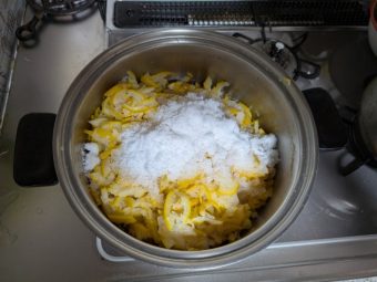 ②水気を切って、鍋に柚子の皮と砂糖、絞り汁を入れて火にかけ、とろみのつくまで煮詰めます。