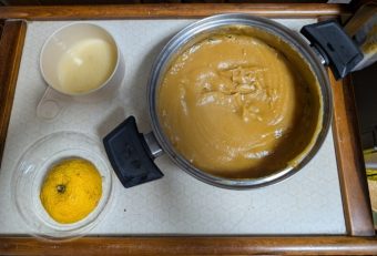 ②鍋に味噌と砂糖、酒、みりんを入れ、火にかけこげないようによく混ぜる。好みの味になるよう、砂糖を調節し、火を止める。 粗熱が取れたら、