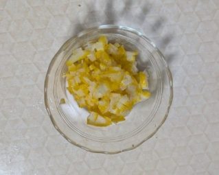 ①柚子は半分に切って、汁を絞り、皮はさっと茹でてみじん切りにしておく。