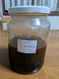 柚子皮と柚子絞り汁を加え、びんに入れて保存する。