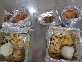 それから紙皿を一緒に作り、配膳。 「本当にご飯が炊けてる!」と驚いておられました。 α化米の試食も準備され、皆さん感想を口にしながら召し上がっておられました。