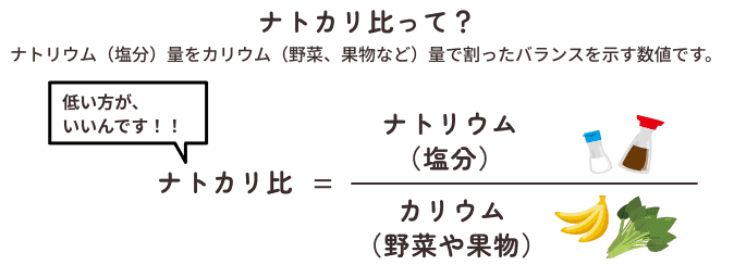 日本人で減塩が進まない理由に、塩味が日本食の美味しさの大事な成分で、減塩すると美味しさを損なうことが考えられます。そこで最近は、「食塩[ナトリウム]と反対の作用をもつカリウム」が注目されています。ナトリウム摂取量をカリウム摂取量で割った比である「ナトカリ比」は、食塩摂取量が多いと大きくなり、カリウム摂取量が多いと小さくなります。