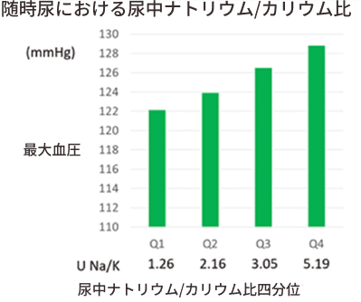 健診時の随時尿検査において、尿中ナトリウム/カリウム比が大きいほど、血圧平均値は高くなりました。