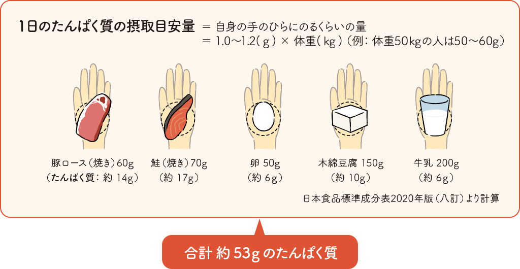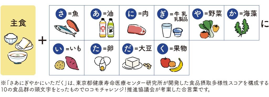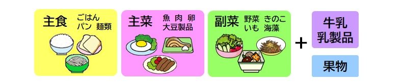 - 主食・主菜・副菜をそろえて、バランスよくとる。