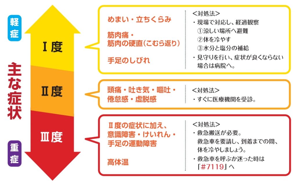 高温多湿な環境に長時間いることで、徐々に体内の水分や塩分(ナトリウムなど)のバランスが崩れ、体温調節機能がうまく働かないことにより発症する障害の総称です。