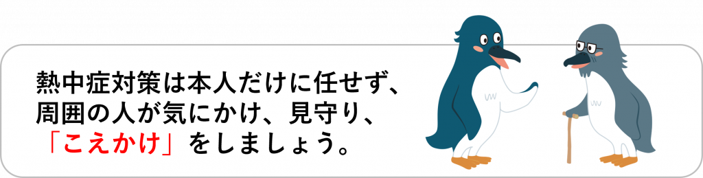 京都市では「こ・え・か・けで熱中症を予防しよう」を合言葉に熱中症予防啓発を行っています。